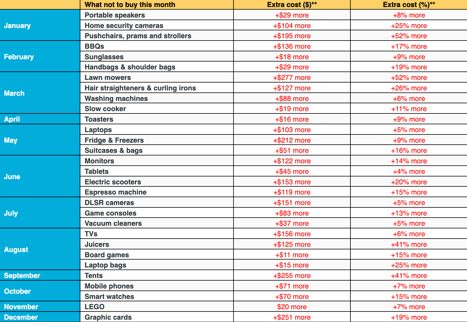 And overall, the difference between buying a BBQ when average costs are at their highest (February) versus when average costs are at their lowest (May), offers a sizeable saving of $394.