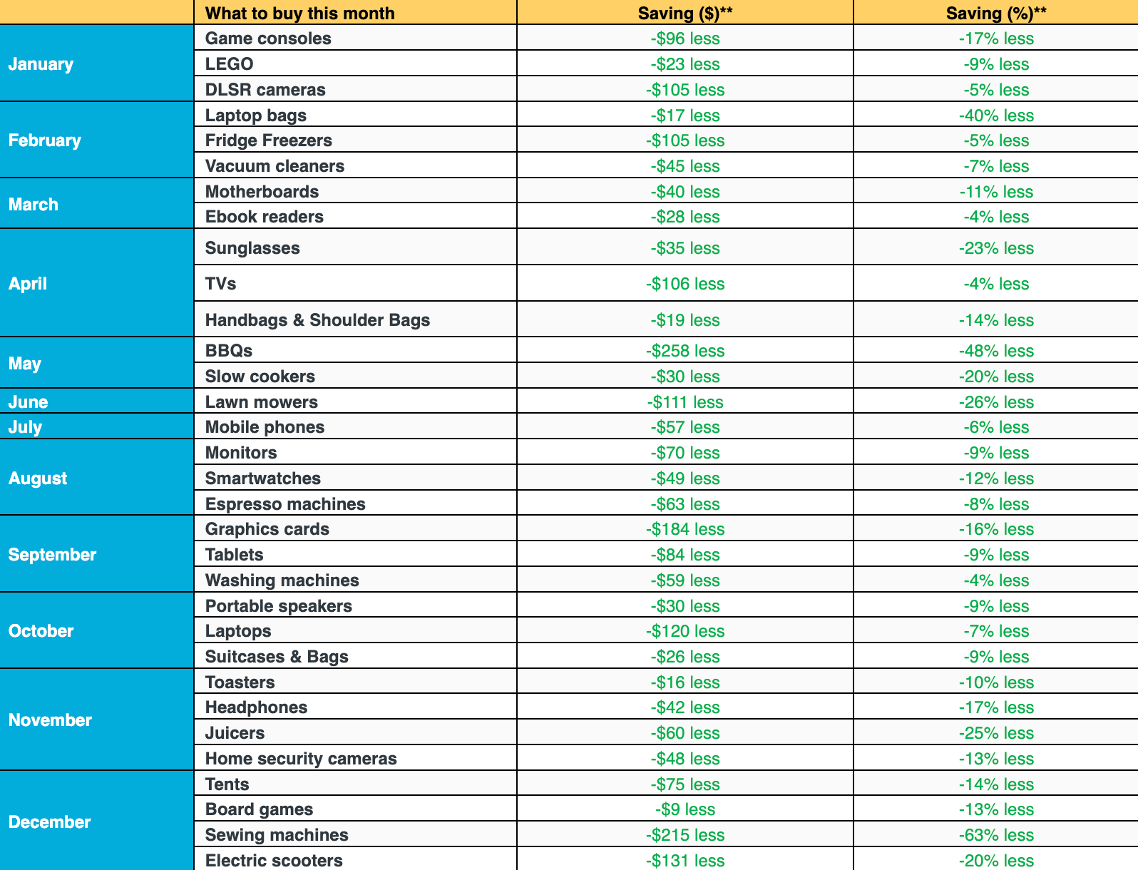 Dependent on the month of the year consumers purchased, PriceSpy’s research revealed considerable savings can be easily made: