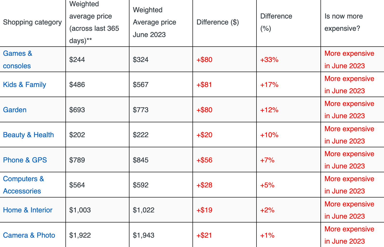 “And, surprisingly, amongst the biggest price surges came from the category of ‘kids and family’, where average price points were found to cost approximately $81 more in June 2023, compared to the rest of the year**, says Carl.”