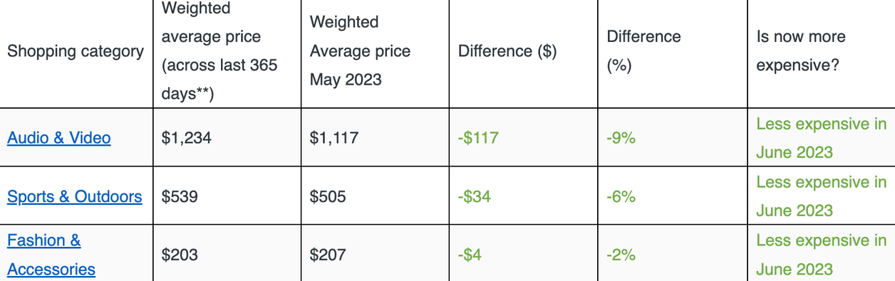 The study examined average price points across thousands of products listed under popular shopping categories on PriceSpy in June 2023. These were then compared to average price points across the last year, to see whether price points were showing signs of falling or still increasing.