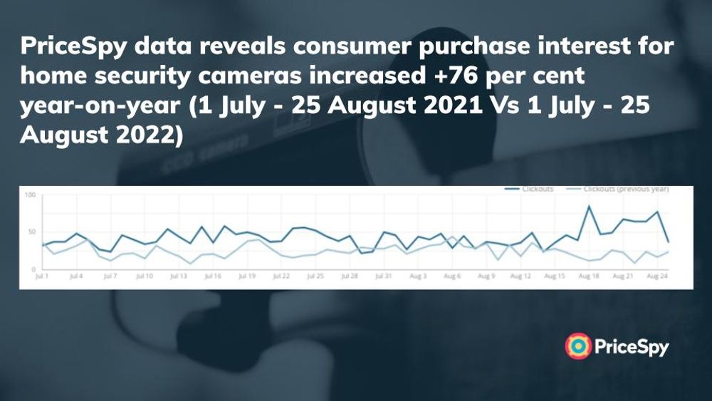 Source: Consumer purchase interest data from PriceSpy for home security cameras (light blue is 2021 and dark blue is 2022)