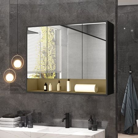 Bathroom Mirror Cabinet Medicine Shaving Vanity Shaver Cupboard Toilet Wall Storage Organiser Shelves Furniture with LED Lights Doors Black 90x13x75cm