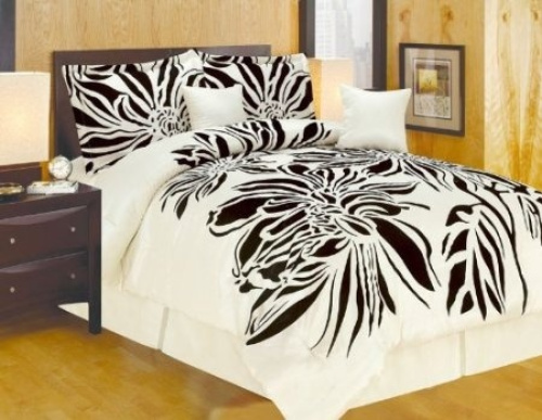 OctoRose Oversize King Faux Silk Modern Beige & Black Flocking Satin Comforter Set — Bedding-in-a-Bag (Includes Comforter, Shams, Bed Skirt Decorative Pillows)