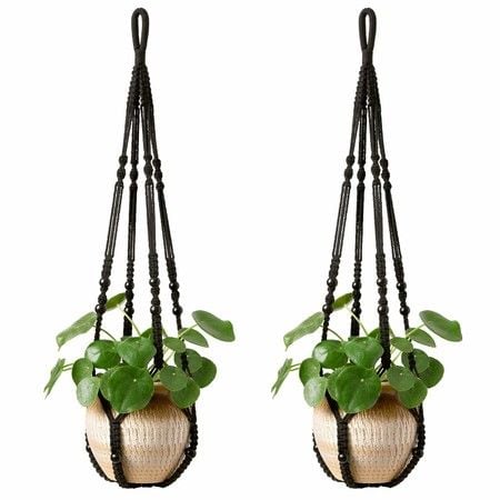 Macrame Plant Hanger Indoor Hanging Planter Basket with Wood Beads Decorative Flower Pot Holder No Tassels 90cm,Black,2Pack (POTS NOT Included)
