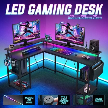 Gaming Desk L Shaped Computer Racer Standing Table LED Lights with Storage Bag Shelves Carbon Fibre Corner Office