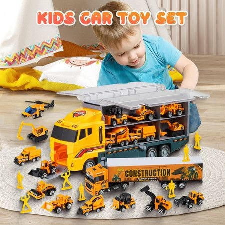 Construction Vehicle Mini Engineering Storage Truck Toys Play Set 19 In 1 Car Carrier Transport Excavator Forklift Crane Bulldozer Toddler Birthday Gift