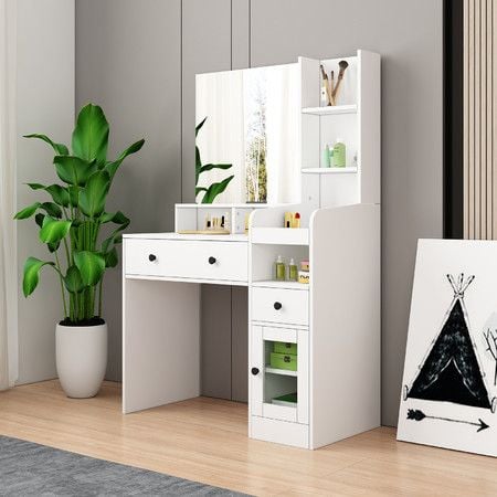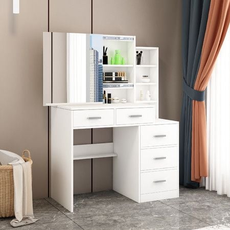 Dressing Table Vanity Mirror Dresser Makeup Desk With Drawers Storage 4 Shelves Bedroom Furniture White Modern