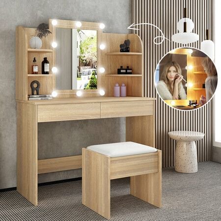 Dressing Table Lighting Dresser Vanity Makeup Mirror Desk Stool Set 10 LED Lighted Bulbs Storage Shelves Drawers Modern Wooden Bedroom Furniture Oak