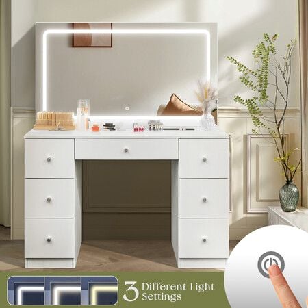 XL Size Vanity Makeup Table Lighting Dressing White Dresser Desk Bedroom Furniture with Mirror LED Light Strip 7 Storage Drawers 3 Lighting Colours