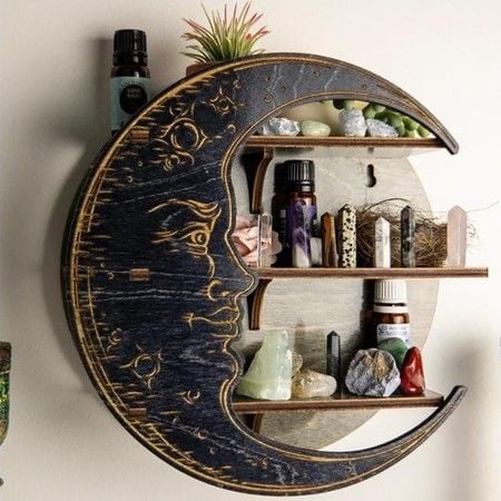 Wall Mounted Crystal Display Moon Shelf, Wall Decor Wood Shelves, Glass Shelf, Crystals Holder For Essential Oil Shelf In Living Room