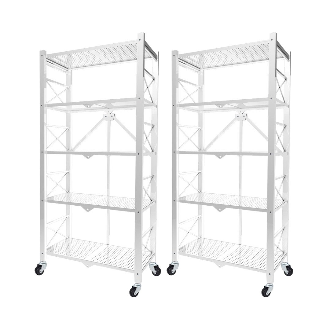 SOGA 2X 5 Tier Steel White Foldable Display Stand Multi-Functional Shelves Portable Storage Organizer with Wheels - - KitchenXY030X2