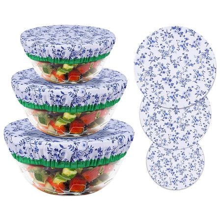 3 Pcs Elastic Bowl Cover Set Cotton Bowl Covers Washable Reusable Food Storage Covers Fabric Bowl Lid for Food Fruit Bread Remnants Suitable, Blue Flower