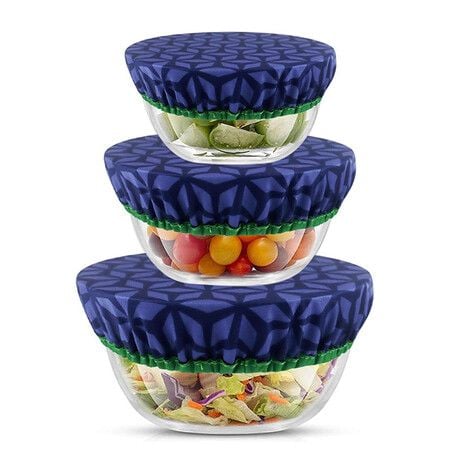 3 Pcs Elastic Bowl Cover Set Cotton Bowl Covers Washable Reusable Food Storage Covers Fabric Bowl Lid for Food Fruit Bread Remnants, Blue Geometry