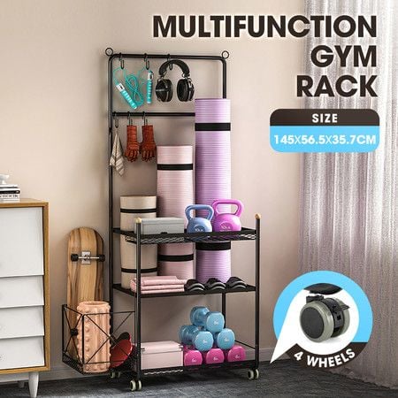 Yoga Mat Ball Storage Rack Weight Dumbbell Kettlebell Shelves Shelf Garage Racking Holder Steel Stand Gym Organizer with Hooks Wheels
