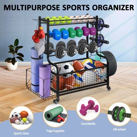 Sports Equipment Ball Storage Rack Cart Garage Organiser for Yoga Mat Dumbbell Kettlebell Home Gym Holder with Hooks Wheels