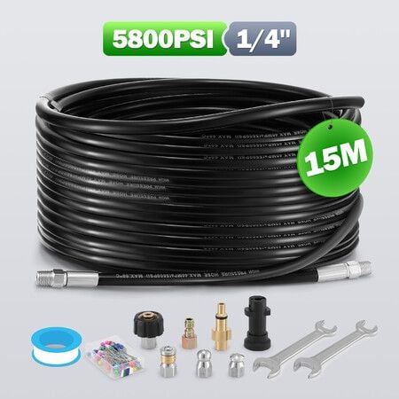 15m Sewer Jetter Kit for High Pressure Washer Blaster Drain Cleaner Hose 5800PSI 1/4 Inch NPT Corner Jetting Cleaning Pipe Button Nose Rotating Nozzle