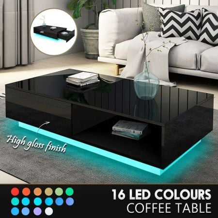 Modern Rectangle Coffee Table Gloss Living Room Storage Furniture 2 Drawers 16 LED Colours Black