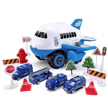 Children Aircraft Toy Track Inertia Toy Car Plane Model With Large Storage Space with 4 Cars (Blue)
