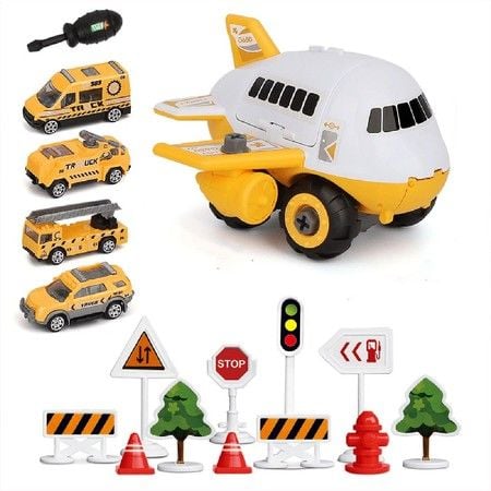 Children Aircraft Toy Track Inertia Toy Car Plane Model With Large Storage Space with 4 Cars (Yellow)