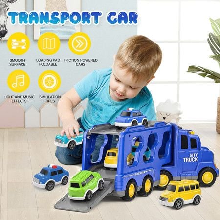 Cars Toys Carriers Trailer Transport Storage Truck Pull Back Steering Construction Bus Police Vehicle Model Friction Power with Light Sound Toddler Gift