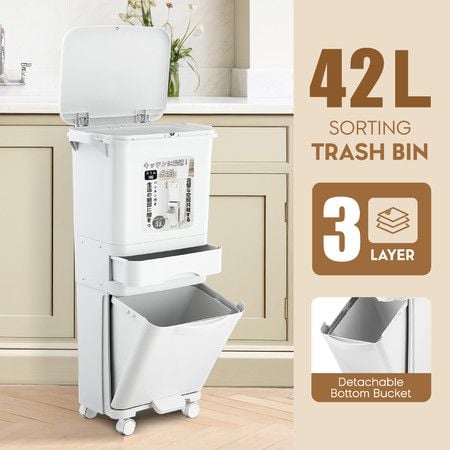 42L Rubbish Bin Pedal Step Dustbin 3 Tiers Recycle Garbage Kitchen Trash Can Sorting Waste Bucket Trashcan House Office Indoor with Wheels
