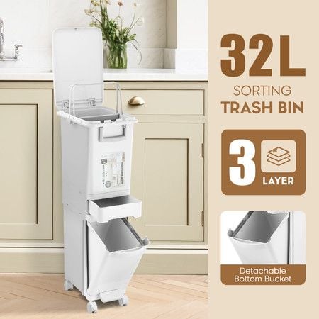 32L 3 Tiers Rubbish Bin Pedal Step Dustbin Recycle Garbage Kitchen Trash Can Waste Sorting Bucket Slim Trashcan Sorter Office Indoor with Wheels