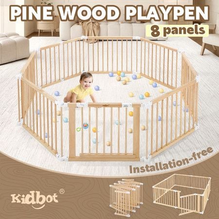 Kidbot Baby Playpen Gate 8 Panel Kids Pet Dog Wooden Safety Fence Activity Centre Play Yard Pen Foldable Travel Guard