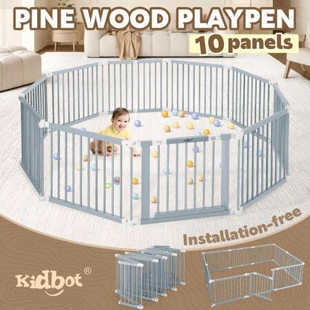 Kidbot Baby Playpen 10 Panel Wooden Safety Gate Kids Pet Dog Activity Centre Fence Play Yard Pen Travel Foldable Toddler Guard Barrier Safe Enclosure