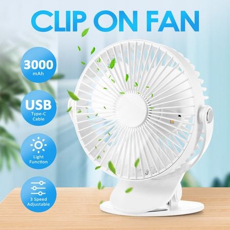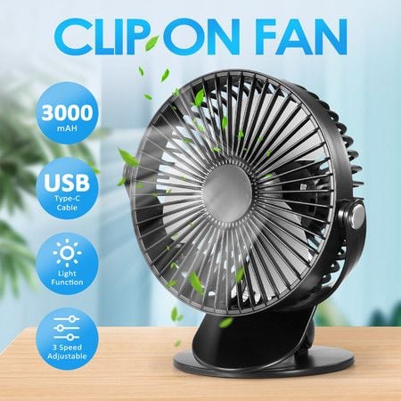 USB Desk Clip On Fan Portable Cooling Clamp Table Wall Battery Powered Air Circulator 360 Degree Rotation with Light for Car Stroller Travel Camping