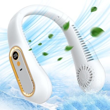 Bladeless Fan Portable Neck Hanging 4000mAh Rechargeable 5 Speeds Adjustable with Digital Display & LED Light Type C Fast Charge White