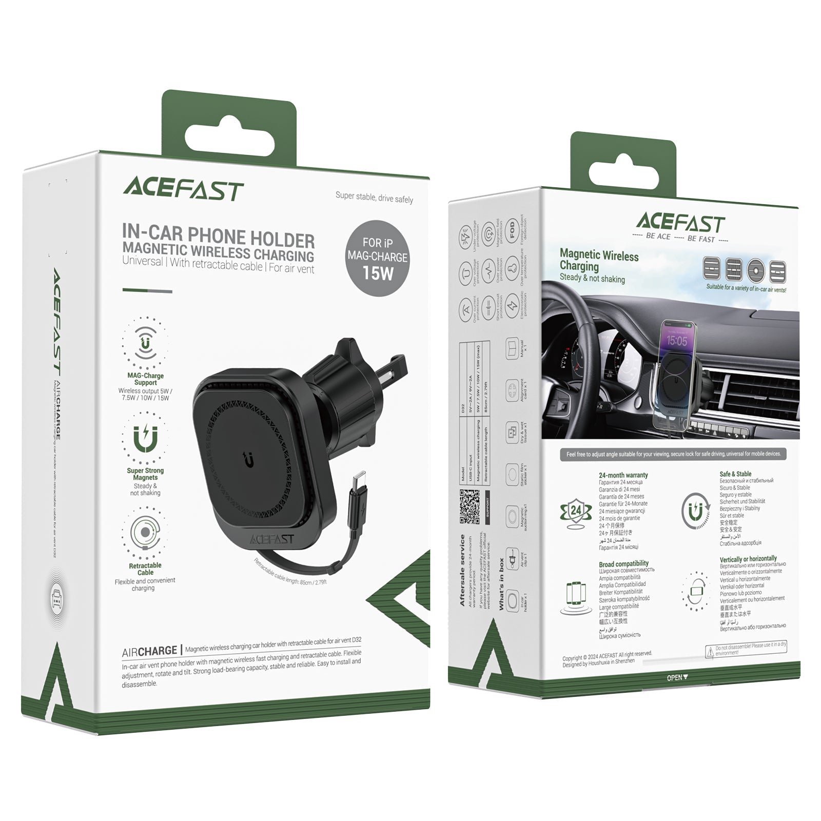 Acefast 15W Magnetic Wireless Charging Air Vent Phone Holder w/ Built-in Retractable Cable (D32)