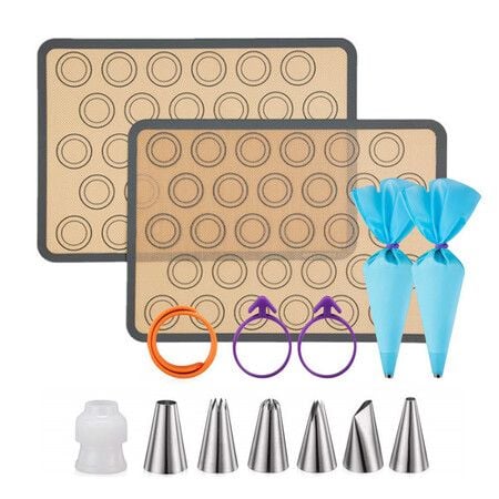 Macaron Silicone Baking Mats Kit 16Pcs,Reusable Silicone Pastry Bags with 2 Half-Size Baker Mats for Home Pastry Baking(Grey)