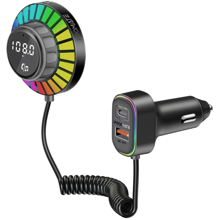 Promate SMARTUNE-EXT RGB FM Transmitter with Handsfree & 30W PD & QC3.0 Ports Includes 1.5m Extenstion Cord, Sound Activated RGB Lights, 48W Total Output, FM Range 87.5-108 Mhz, Operating Distance 10m.