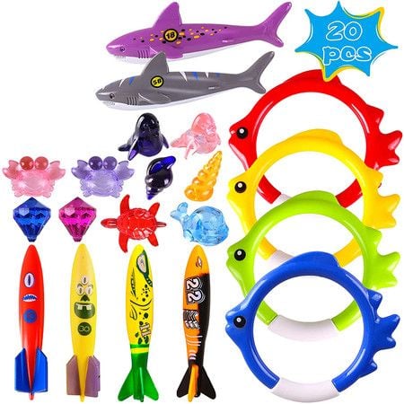 20 Pack Summer Pool Diving Swimming Toys for Kids, Fun Swim Games Sinking Set, Include Torpedo Gems Shark Rings Sea Animals for Boys Girls