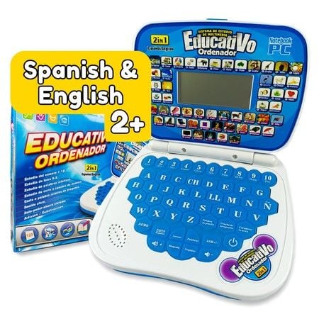 BLue-Bilingual Spanish English Learning Small Laptop Toy with Screen,Educational Computer to Learn Alphabet ABC,Numbers,Words,Spelling,Maths,Music.