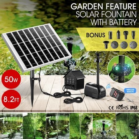 50W Solar Fountain Water Pump with Battery and LED Light for Birdbath Garden Pool