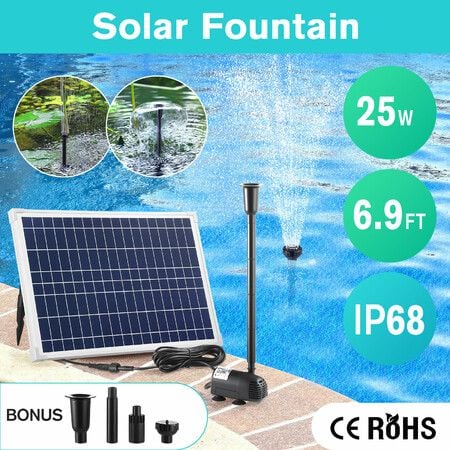 Solar Fountain Pump Panel Kit Submersible 25W Energy Powered Water Feature Outdoor Indoor DIY Bird Bath Fish Tank Pond Pool Garden Decoration Nozzles