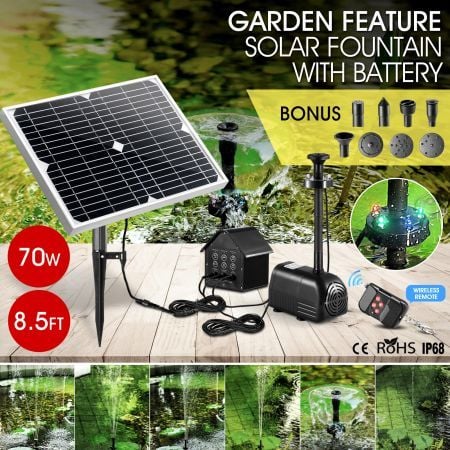 70W Solar Fountain Water Pump with Battery and LED Light for Birdbath Garden Pool
