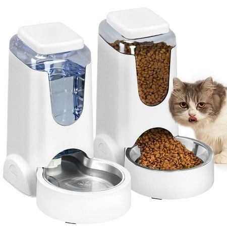 2-Pack Automatic Cat Feeder and Water Dispenser with Stainless Steel Bowls - Keep Your Small and Medium Pets Fed and Hydrated(White)