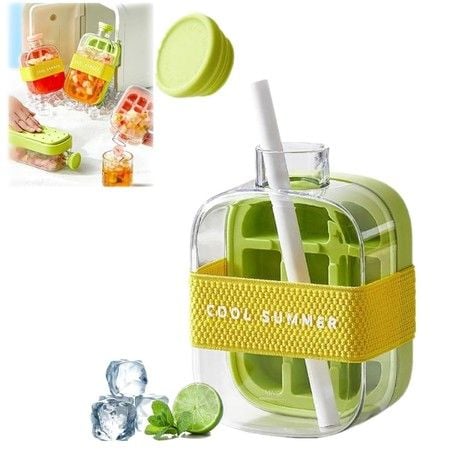 Ice Bottle Cup,2 in 1 Zero Touch Press Ice Cube Mold Water Bottle with Lid and Bin,Easy Press to Release Vertical Ice Cube Tray with Lid (Green,500ML)