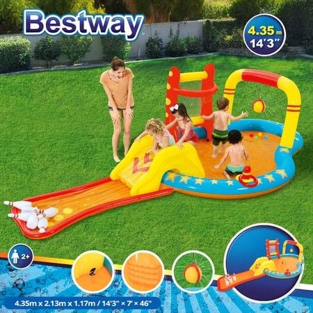 Bestway Lil Champ Water Play Pool Centre Playground Inflatable Splash Park Sprayer Bowling Basketball Ring Outdoor Activity Waterplay 4.35x2.13x1.17m