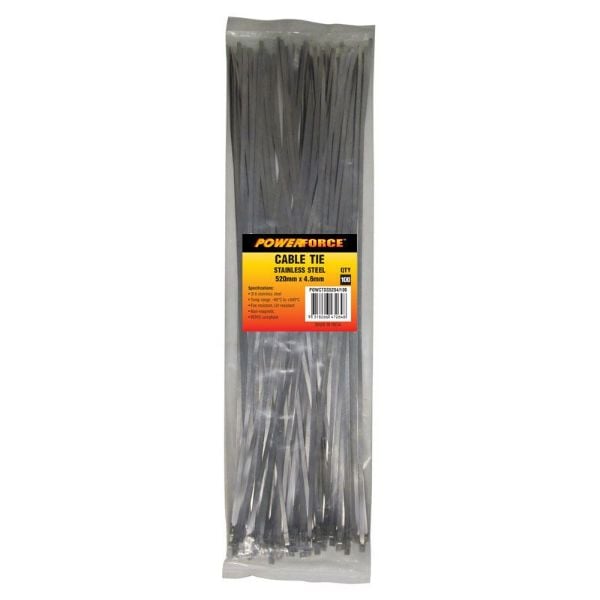 POWERFORCE Cable Tie 316SS 520mm x 4.6mm Pack of 100. Self Locking Ball-lock design. Temp Range: -80C to +500C. Weather - Water - Salt Spray - Corrosion - Fire and UV Resistant. Non-magnetic.