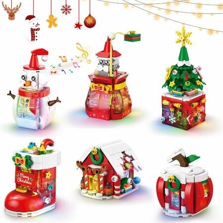 Christmas Element Building Blocks with Lights,Music 6 Pack Christmas Ornaments -Santa Gift Bag,Snowman, Xmas Tree, Stockings, Apple House Winter Cottage