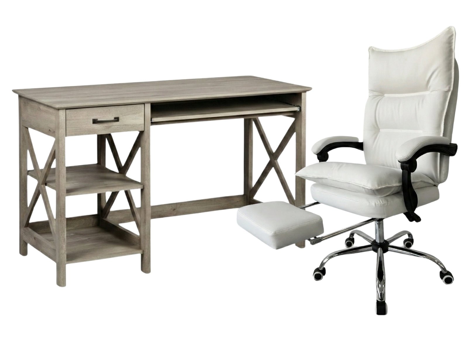 Home Office Desk with Storage Grey & New Markus Office Chair with Footrest PU White (Combo)