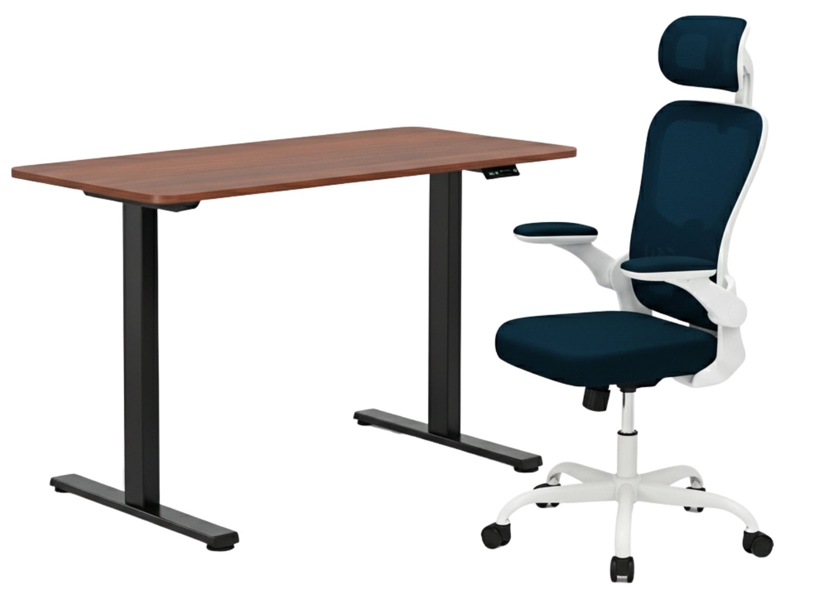 Height Adjustable Desk Set LK walnut Black & Molina Mesh Task Chair White+Blue (Combo)